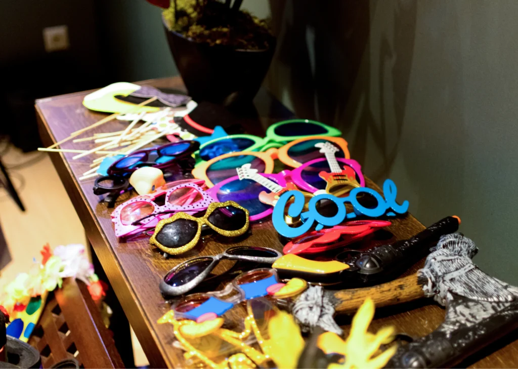 Bardzo ważnym elementem zarówno fotobudki, jak i fotobudki 360 jest atelier z gadżetami. To właśnie ono buduje atmosferę luzu, zabawy i spontaniczności.